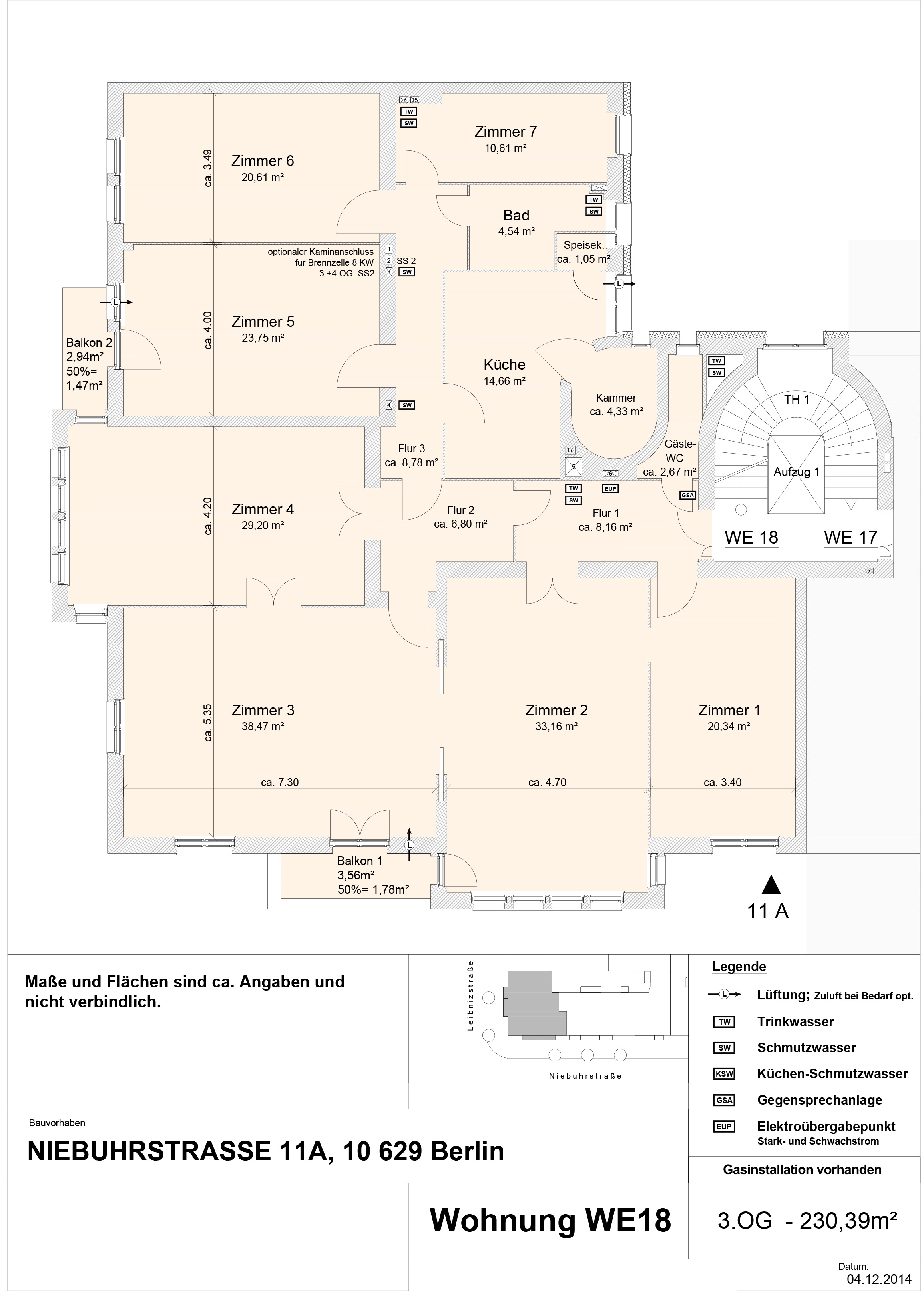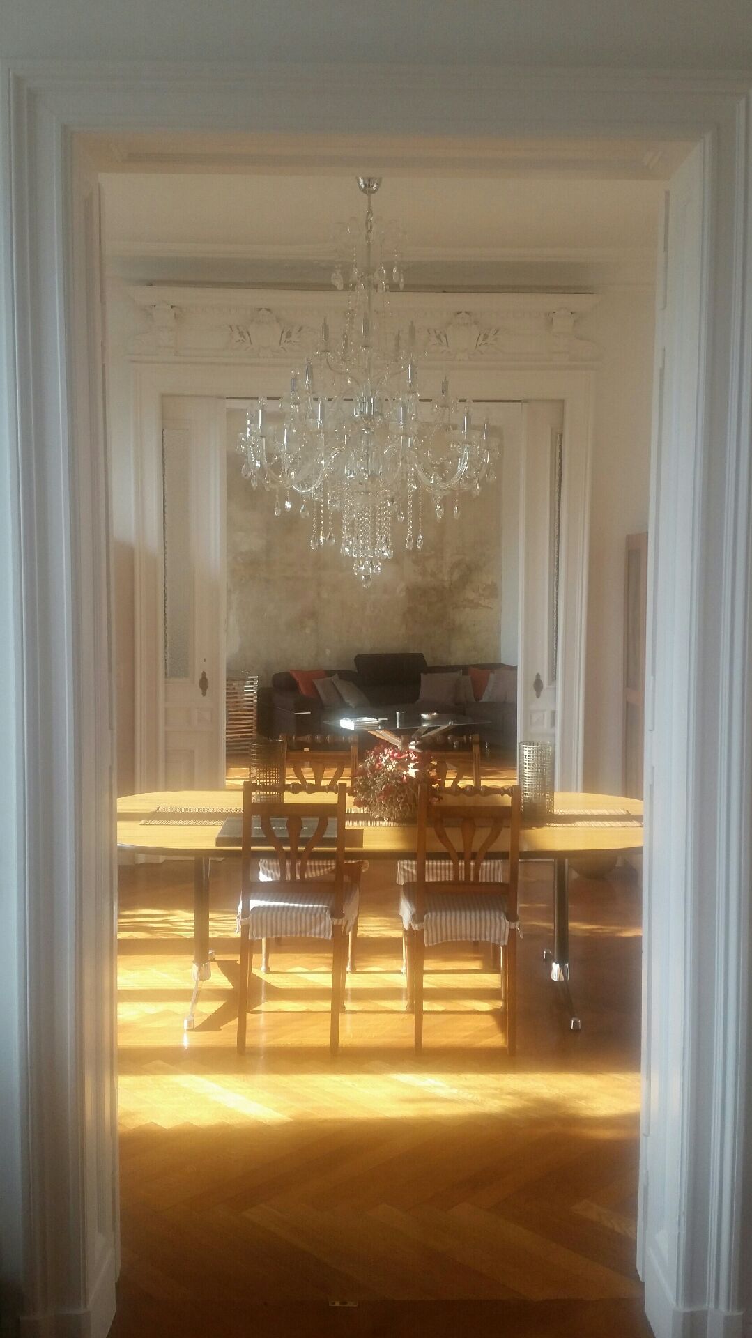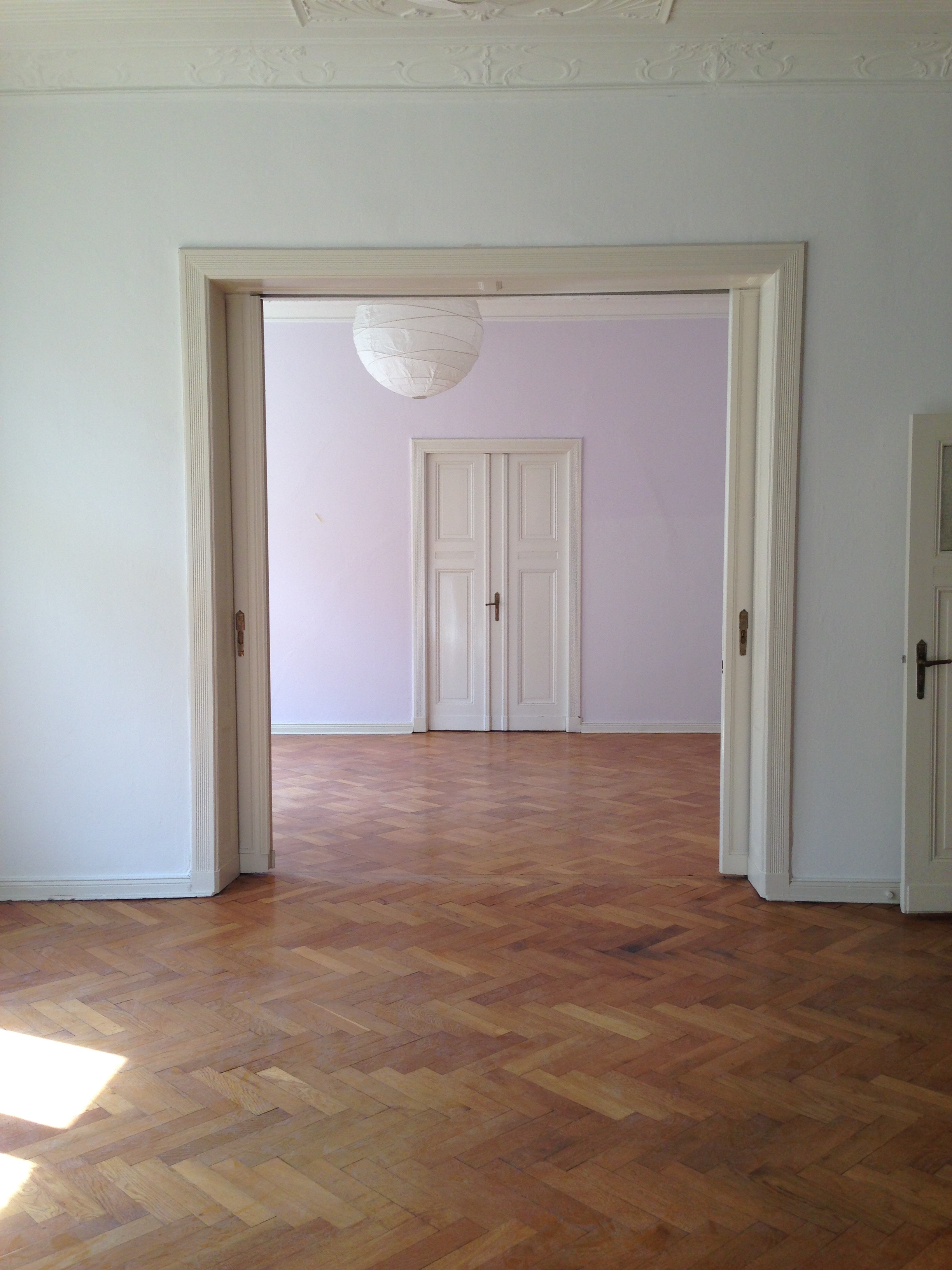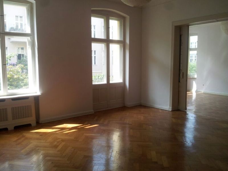 Die beschriebene Wohneinheit, befindet sich im Vordergebäude der Niebuhrstraße 11a in der zweiten Etage, die bequem mit dem historischen Fahrstuhl erreicht werden kann. Sämtliche Zimmer sind mit Parkett ausgelegt und besitzen sehr gut erhaltenen Deckenstuck. Zwei der Wohnzimmer werden durch eine mit Glaselementen verzierte Flügeltür verbunden. Die restlichen Zimmer sind zum Hof ausgerichtet und können daher als potenzielle Schlaf- oder Kinderzimmer genutzt werden.